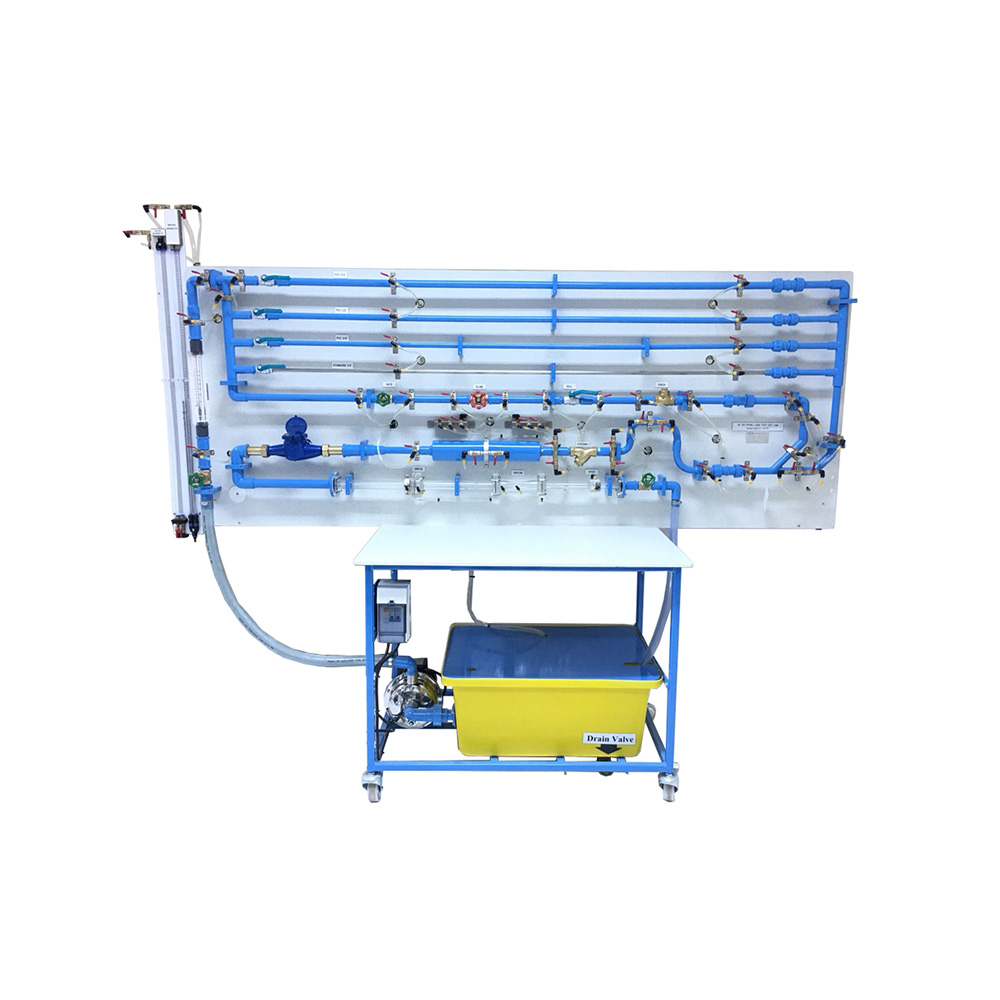 Friction loss is measured by a pressure drop and coefficient of discharge is determined from a pressure drop and a flow rate. Flow rate is obtained from a water meter and a stop watch. The pressure drop is measured by differential pressure using manometer and differential pressure gauge. Pressure tapping is by small ball valves with quick connection. All pressure taps are connected by flexible hoses to a set of specially arranged manifolds such that differential pressure across any component can be measured simply by opening valves without removing the hoses. The unit is on a steel frame on wheels.