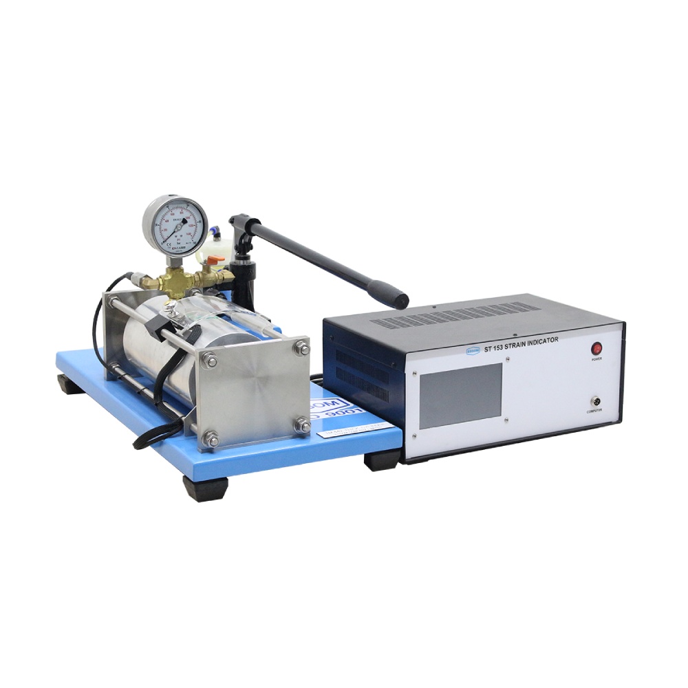 Two halves of thick aluminum alloy cylinders are cemented and clamped together. A hand operated hydraulic pump transmits pressure to the inside of the cylinders via the clamping bolt. The pressure is indicated by a pressure gauge. Strain gauges are of the same gauge factor and the gauges are attached radially and circumferentially along the wall thickness and filled with jointing material. Additional strain gauges are attached on the inside and outside surfaces of the cylinder. Each strain gauge is wired to form a full bridge with temperature compensation gauge and zero adjustment in a bridge box with strain gauge indicator.