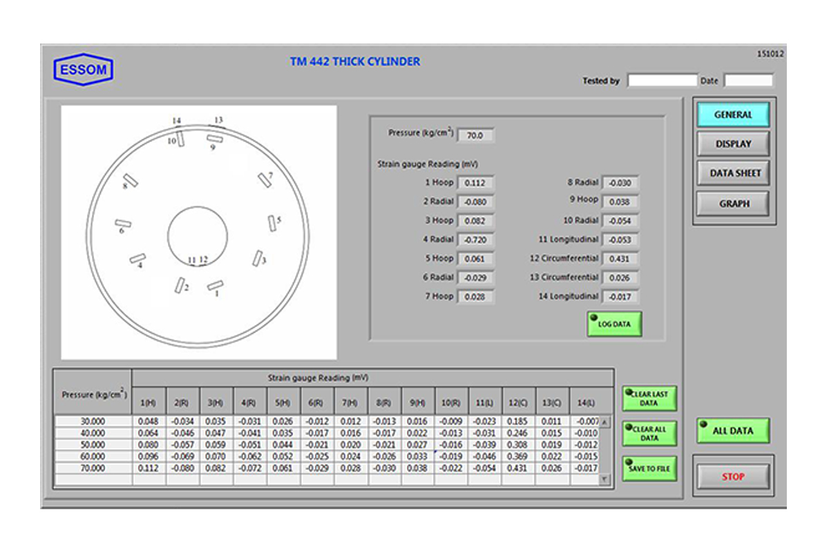 The equipment is used for studying a stress profile in the wall of a thick cylinder. Two halves of thick aluminum alloy cylinders are cemented and clamped together. A hand operated hydraulic pump transmits pressure to the inside of the…